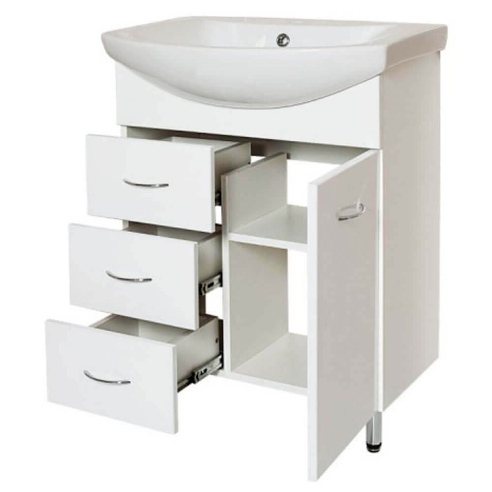 - Тумба оснащена дверкой, полкой и тремя выдвижными ящиками с доводчиками
