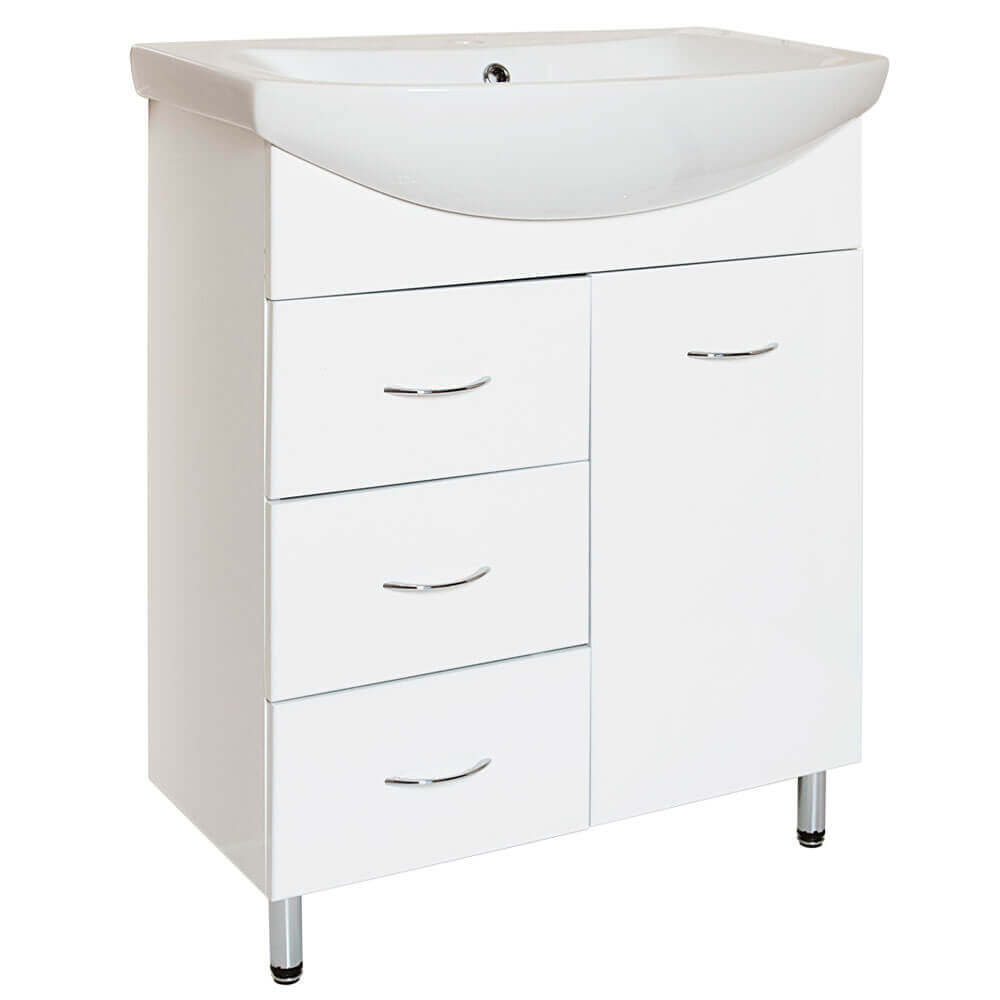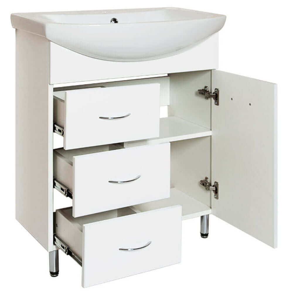 - Тумба оснащена дверкой, полкой и тремя выдвижными ящиками с доводчиками