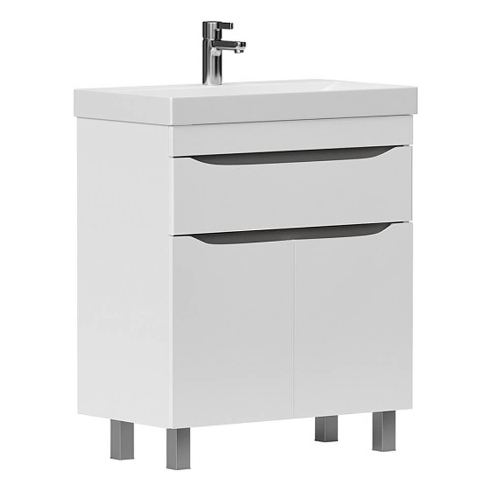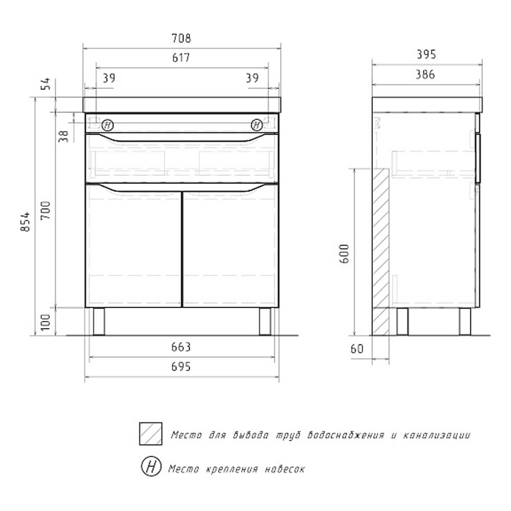 - Ширина тумбы без раковины – 69,5 см, высота без ножек и раковины – 70 см, глубина – 38,6 см