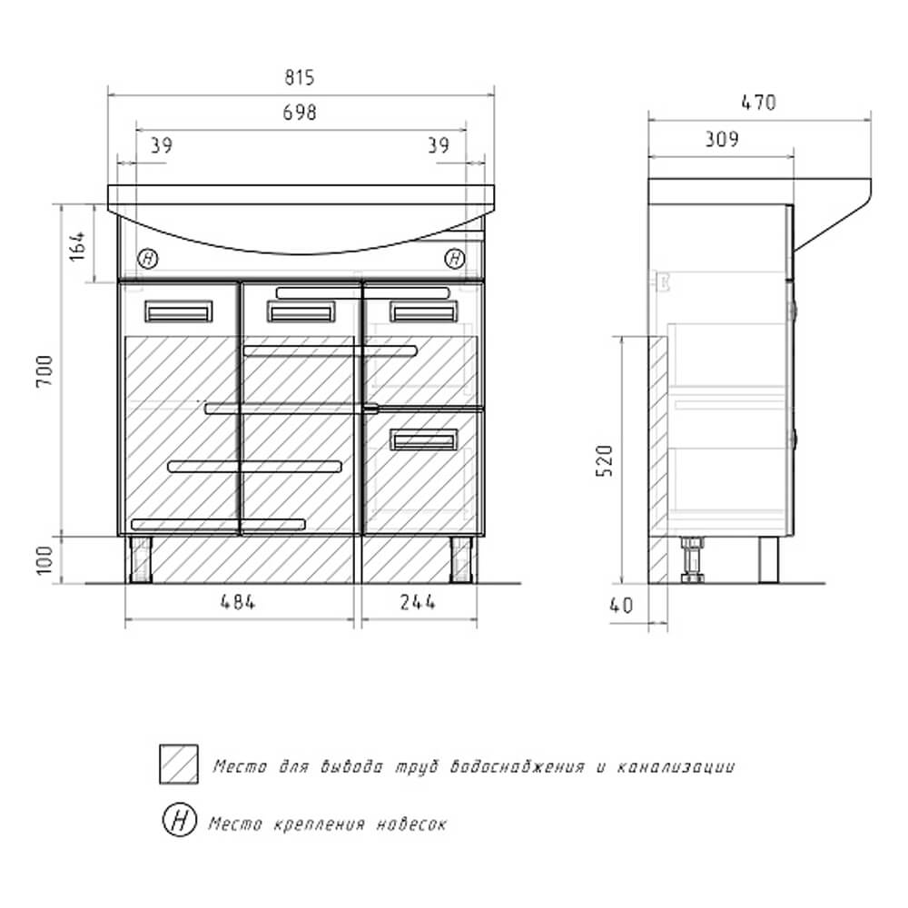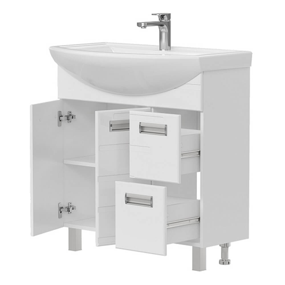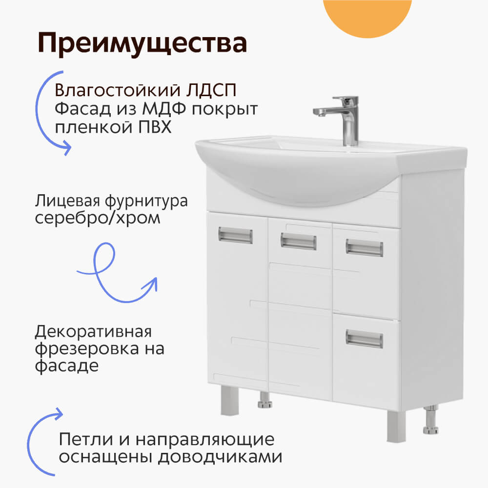 - Ширина тумбы без раковины – 72,8 см, высота без ножек и раковины – 70 см, глубина – 30,9 см