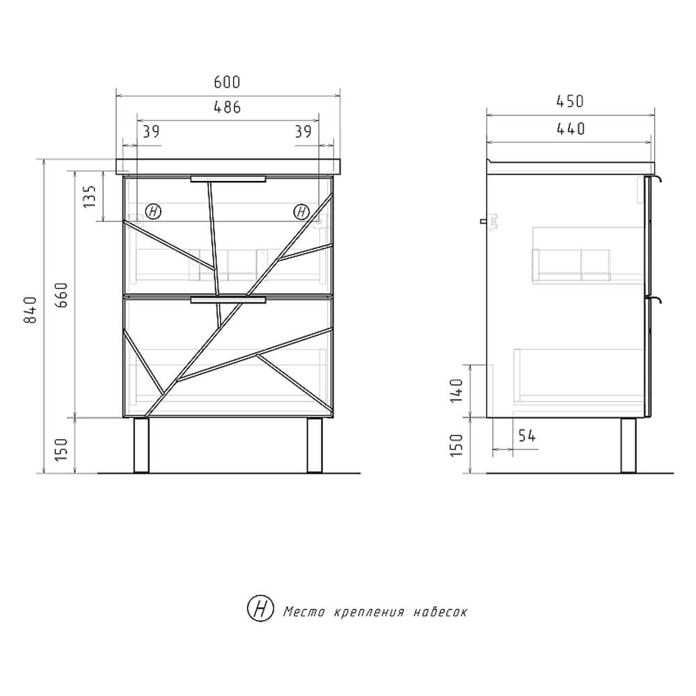 - Ширина тумбы без раковины – 56,4 см, высота без ножек и раковины – 66 см, глубина – 44 см