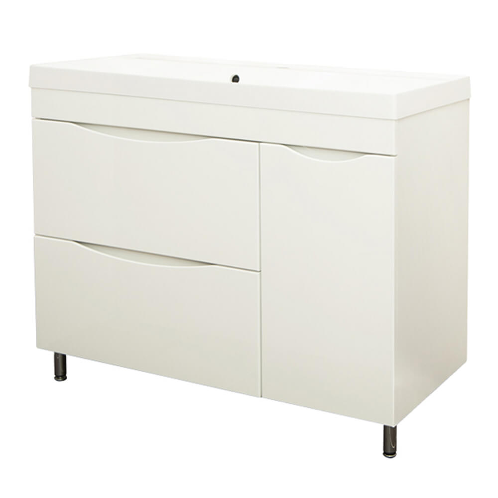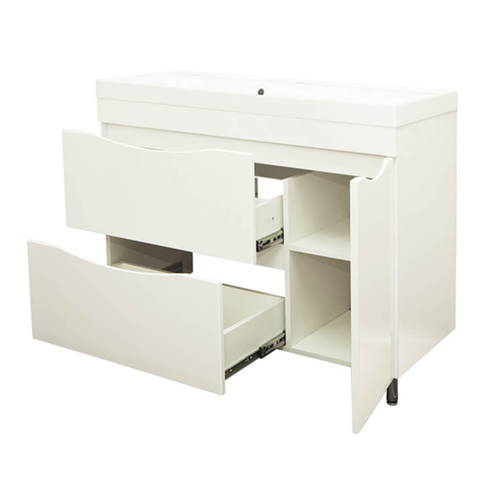 - Тумба оснащена 1 дверцей и 2 выдвижными ящиками с доводчиками
