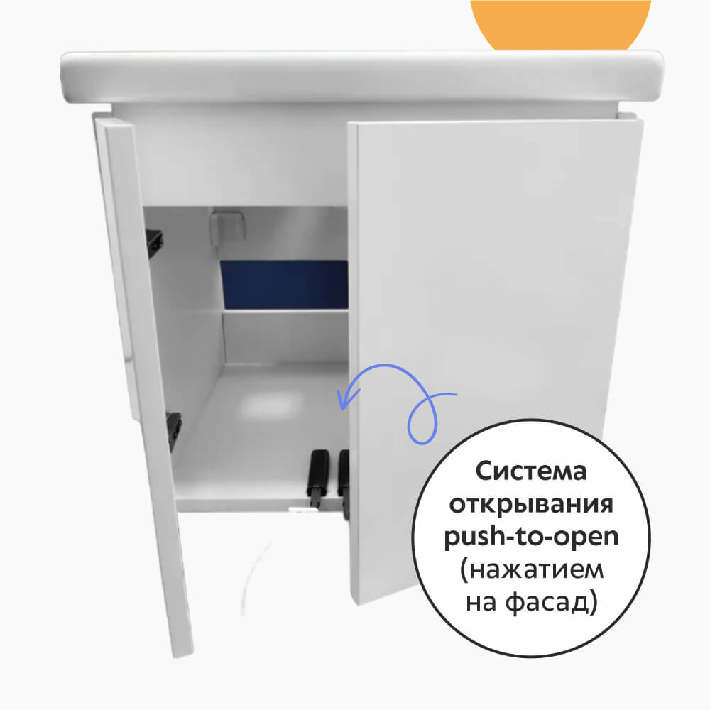 - На фасадах тумбы нет ручек, а открывание происходит с помощью нажатия (система push-to-open)