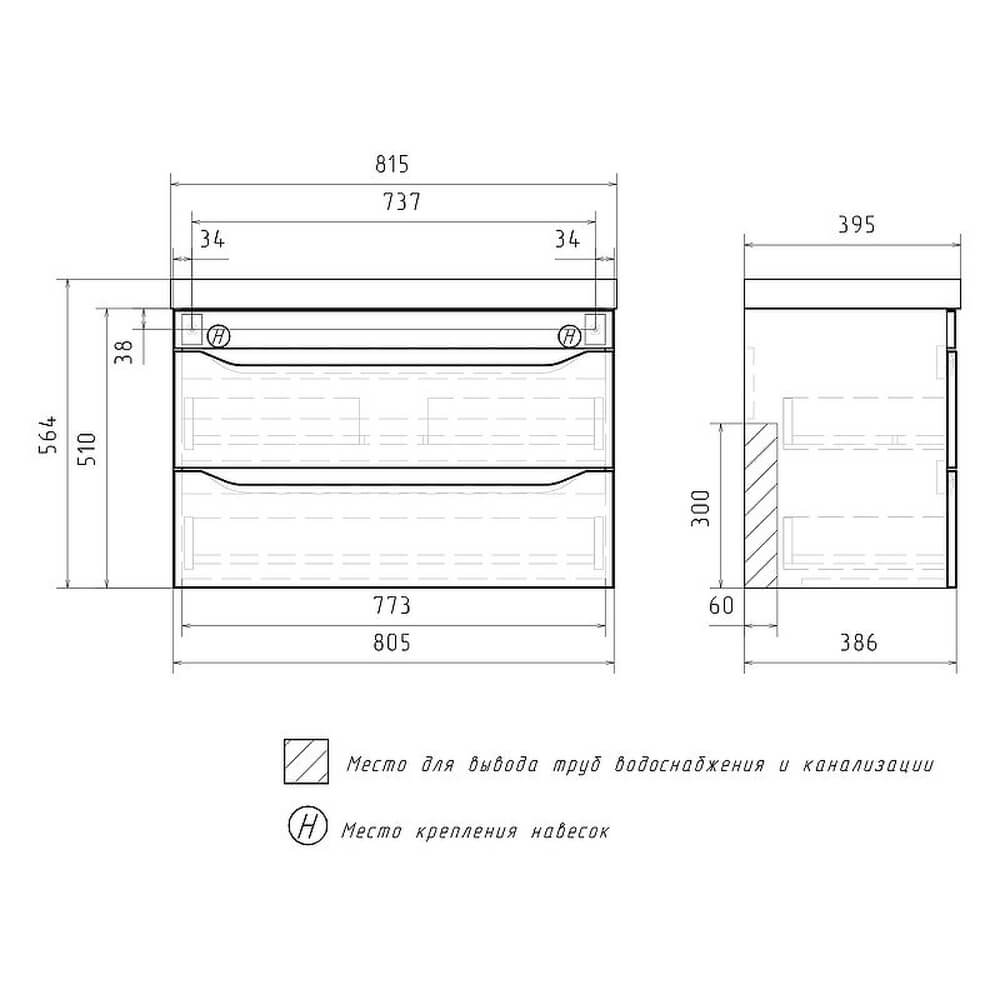 - Ширина тумбы без раковины – 80,5 см, высота без ножек и раковины – 51 см, глубина – 38,6 см