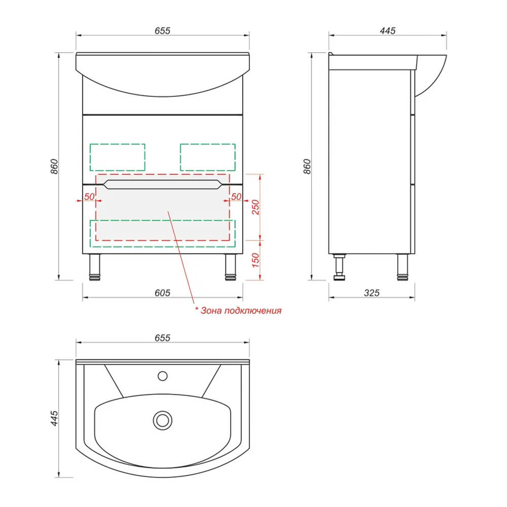 - Имеет 2 ящика на шариковых направляющих. Верхний – с двумя секциями, между которыми пространство для установки сифона