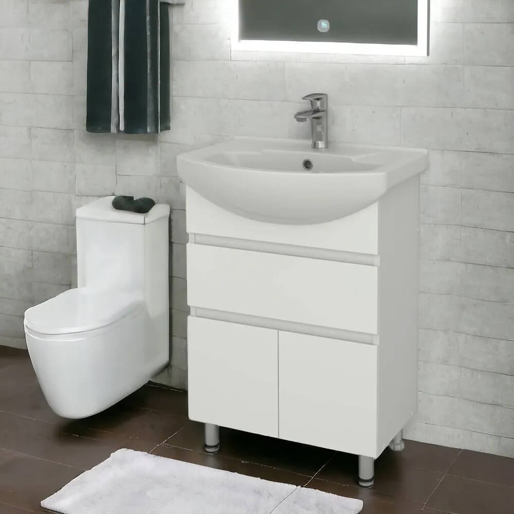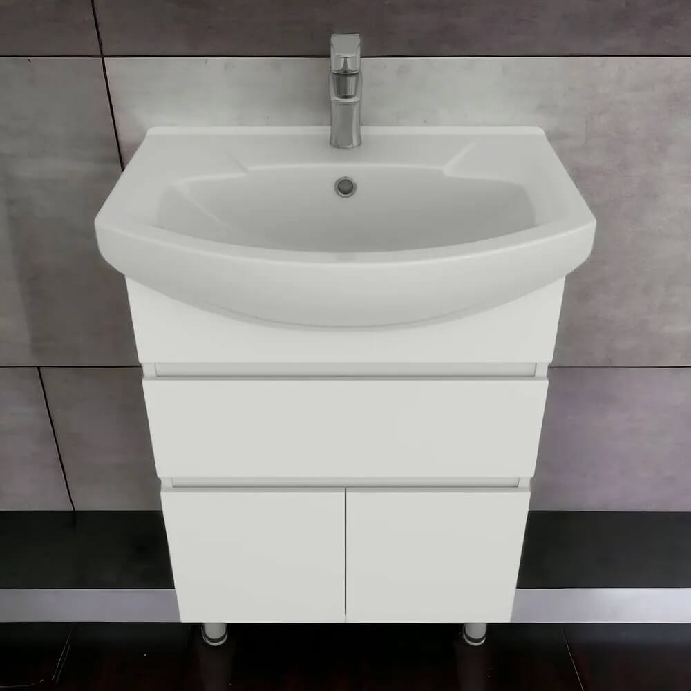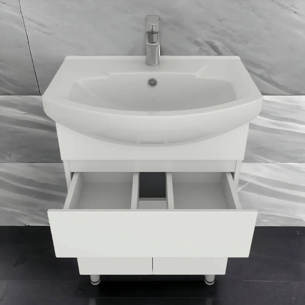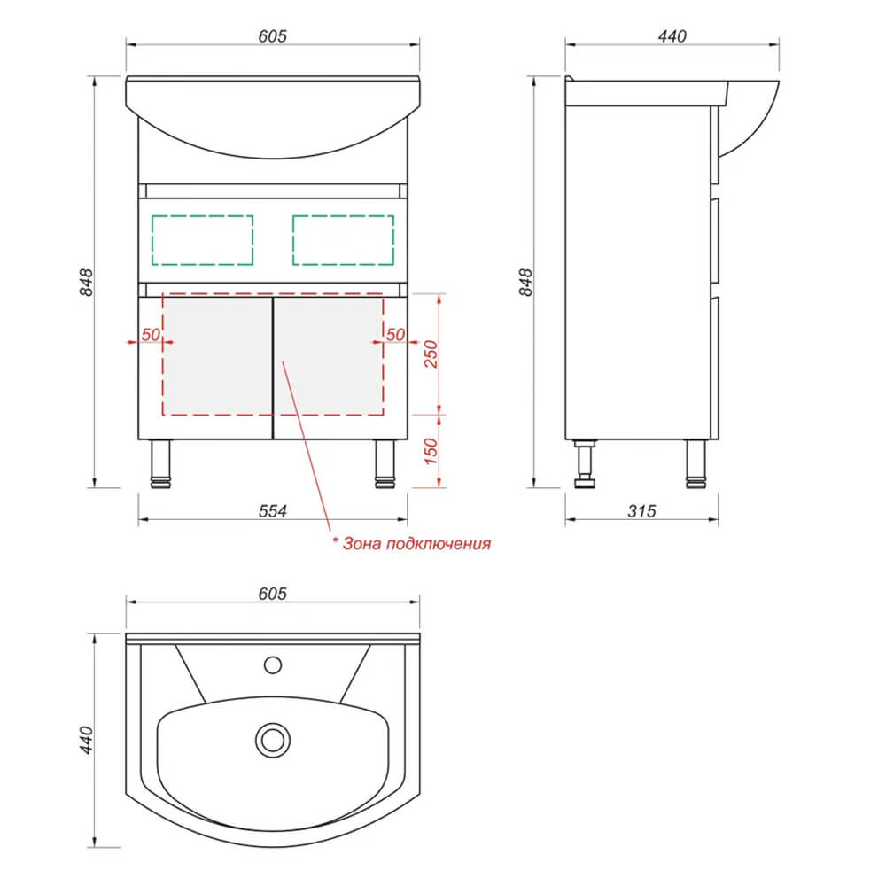 - Ширина тумбы без раковины – 55,4 см, высота без ножек и раковины – 70 см, глубина – 31,6 см