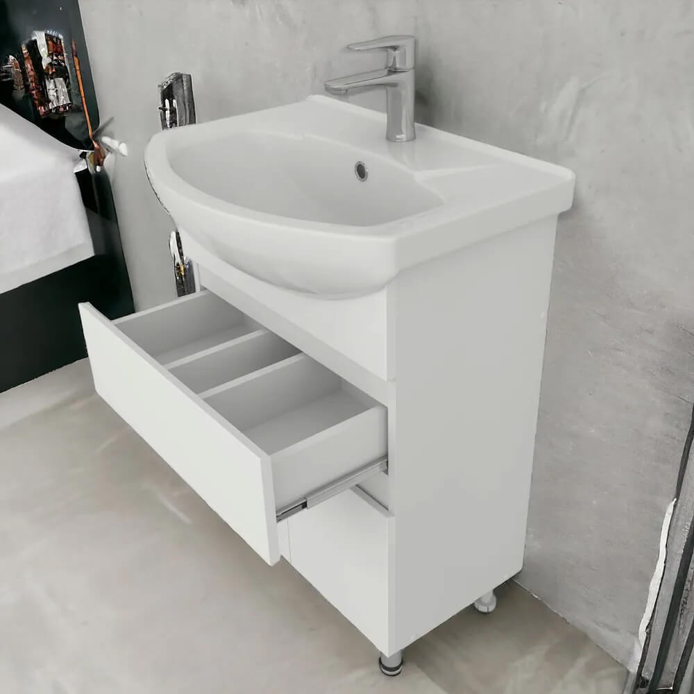 - Имеет 1 ящик на шариковых направляющих с двумя секциями, между которыми пространство для установки сифона