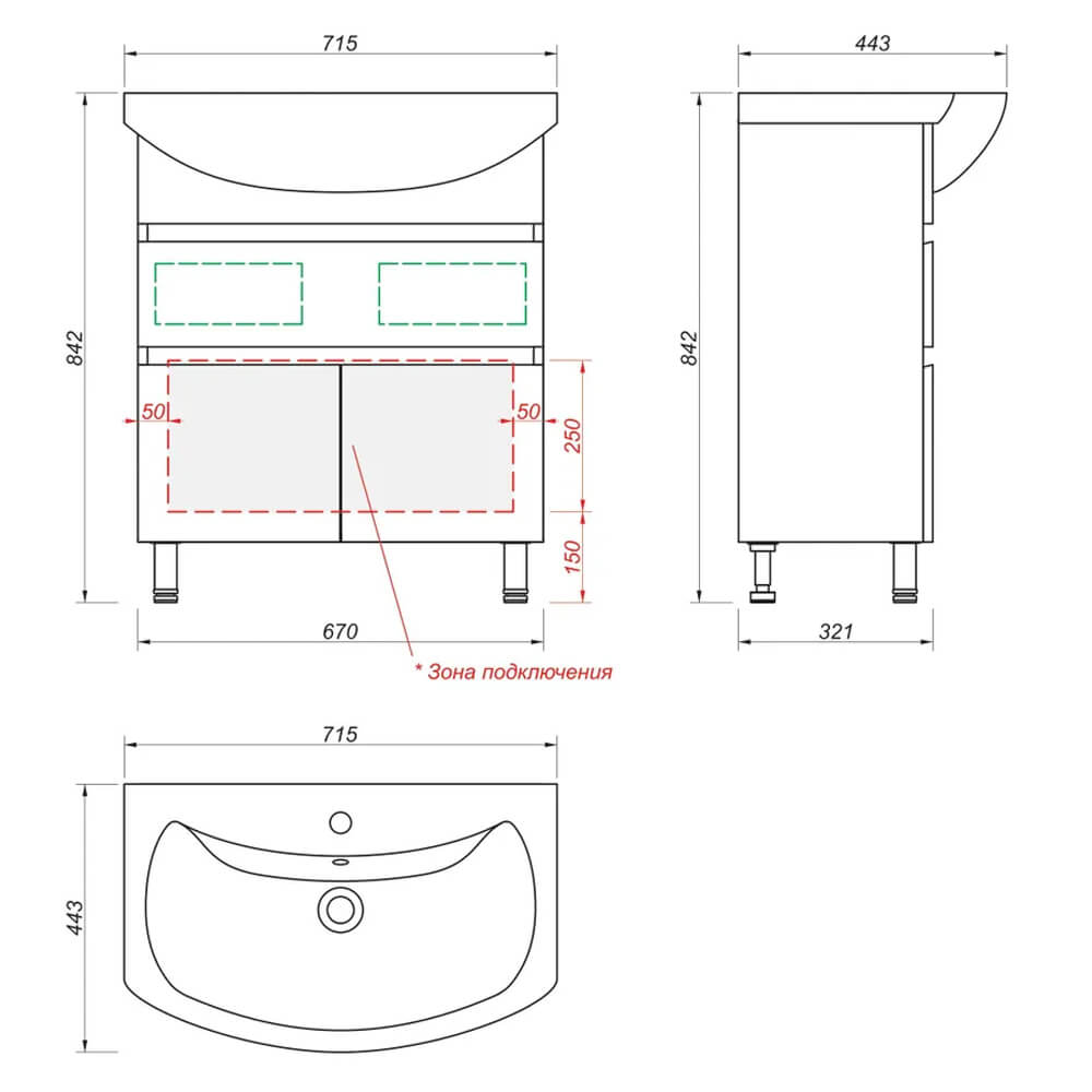 - Имеет 1 ящик на шариковых направляющих с двумя секциями, между которыми пространство для установки сифона