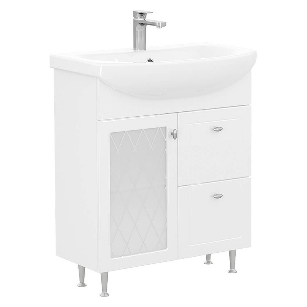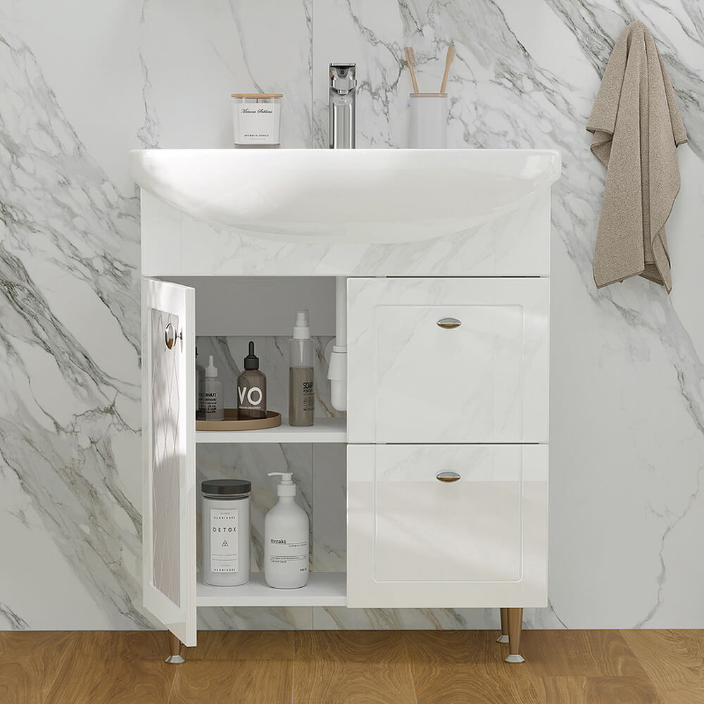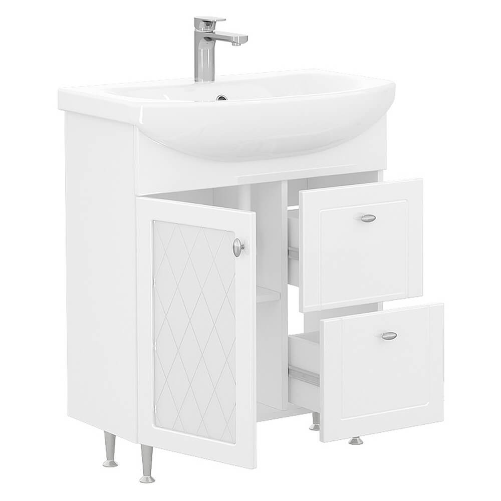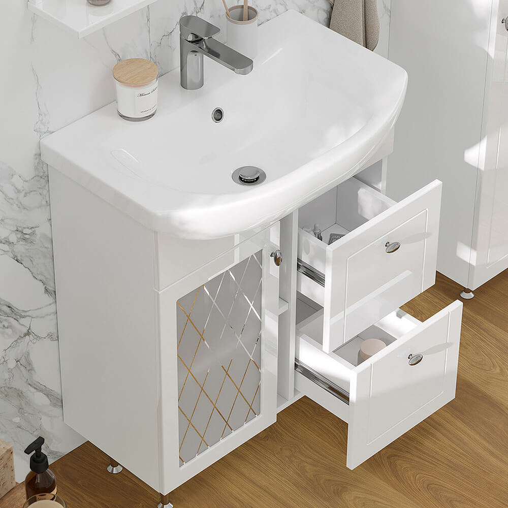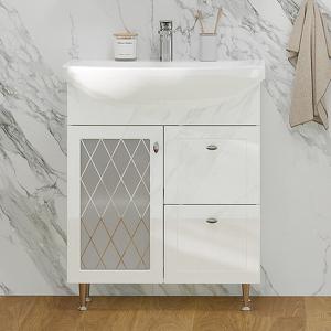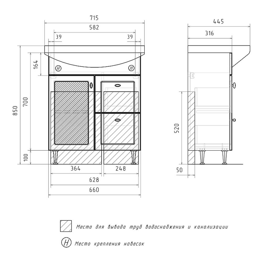 - Ширина тумбы без раковины – 66 см, высота без ножек и раковины – 70 см, глубина – 31,6 см