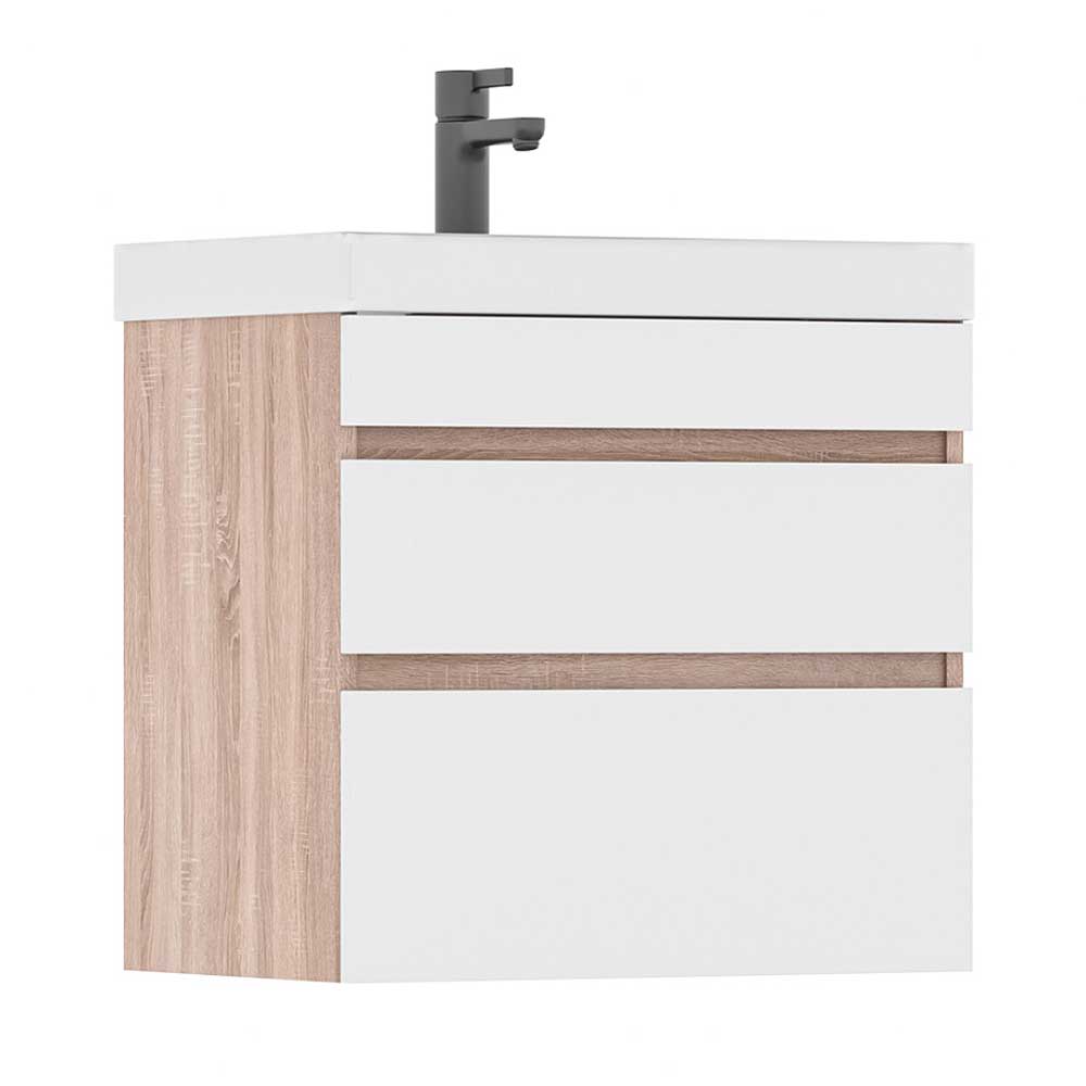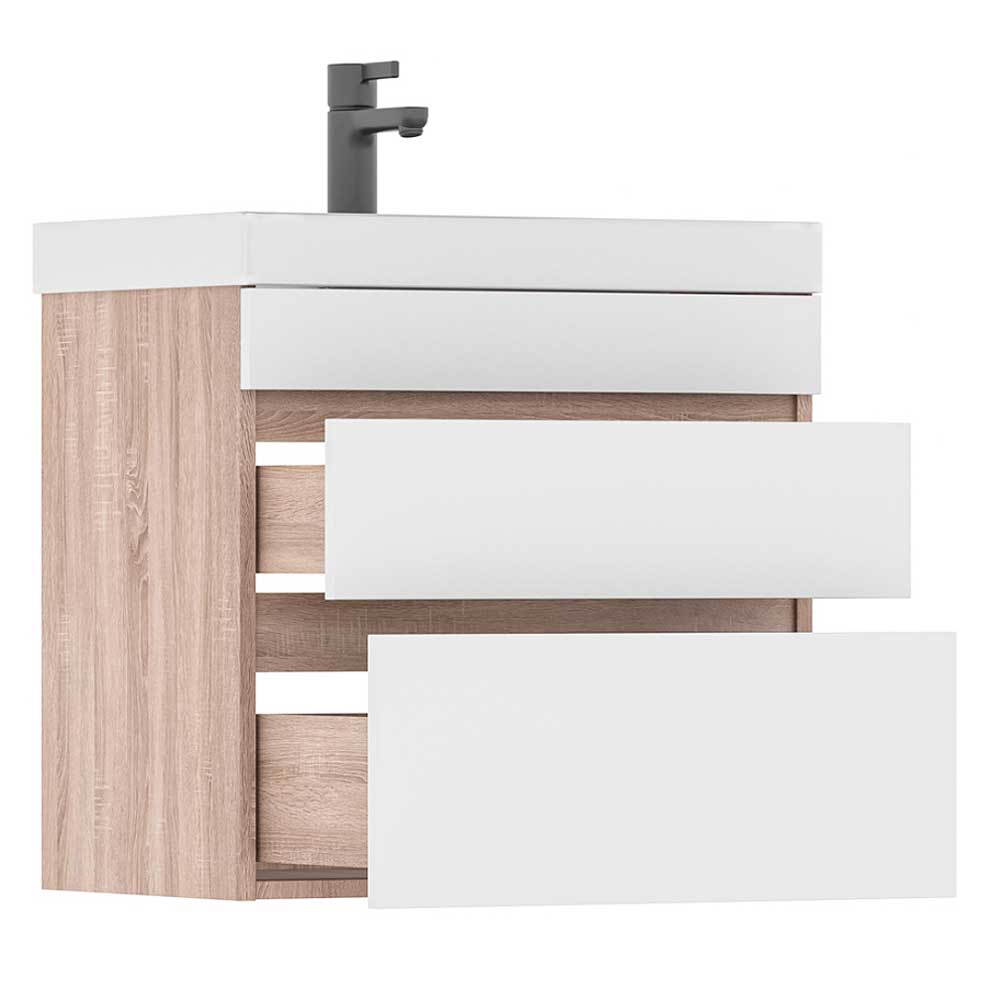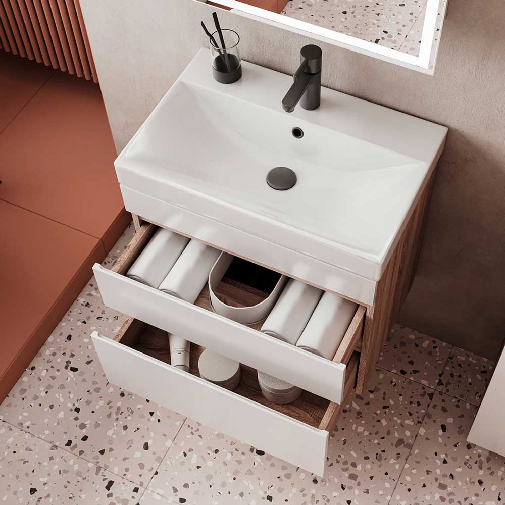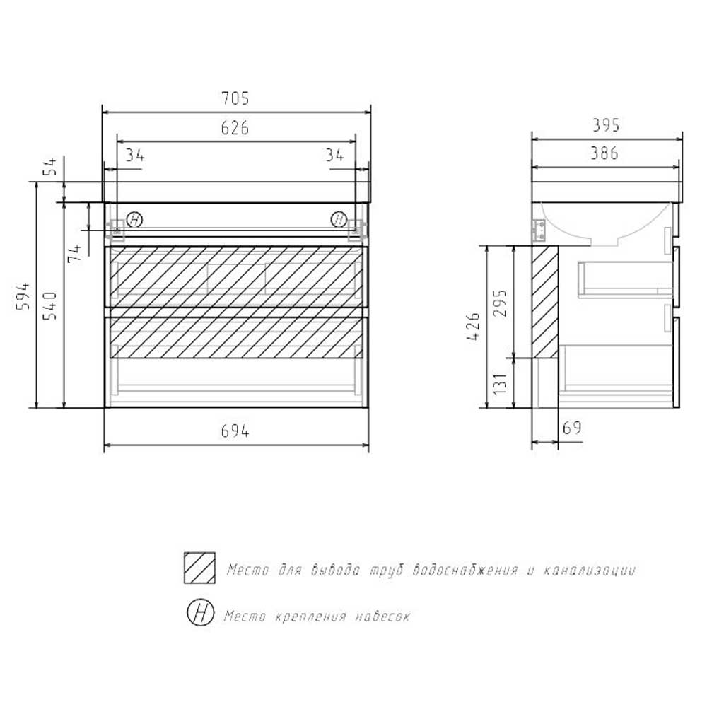 - Ширина тумбы без раковины – 69,4 см, высота без раковины – 54 см, глубина – 38,6 см