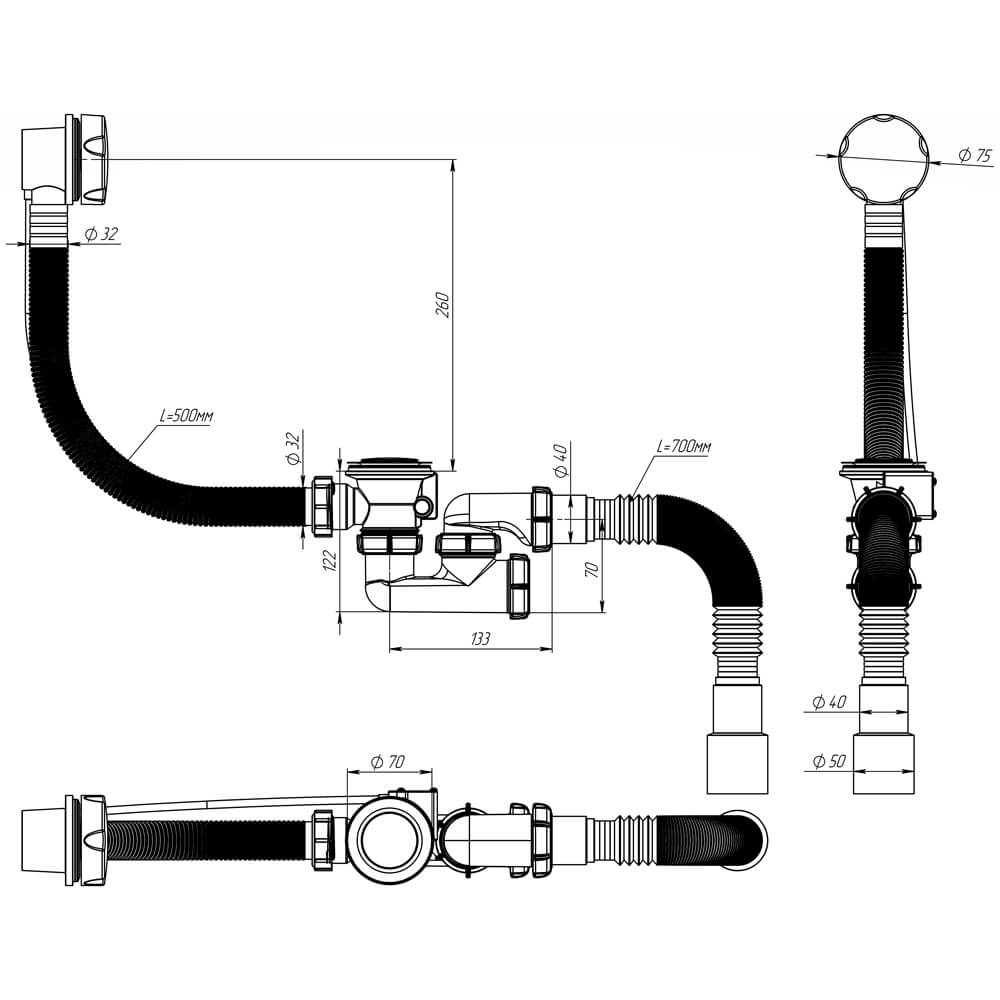 - Гофротруба с универсальным выходом в канализацию 40/50 мм