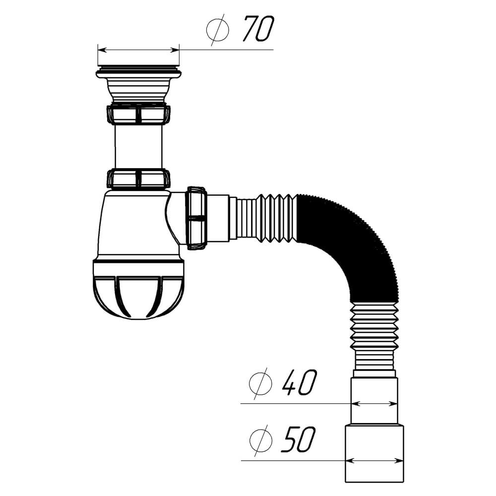 - Корпус сифона увеличен для достижения максимальной проточности и поддержания оптимального уровня гидрозатвора с высотой 55 мм