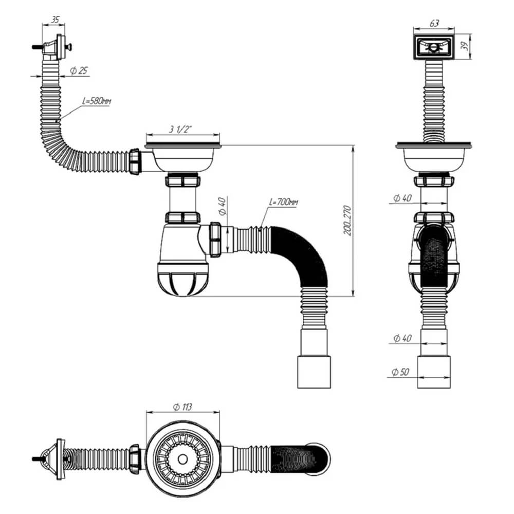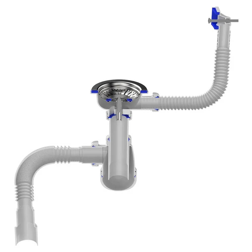 - Выпуск 3 1/2": разборный, с двумя решетками 113 мм и ситечком 78 мм, с переливом и прокладками под прямую и круглую мойки