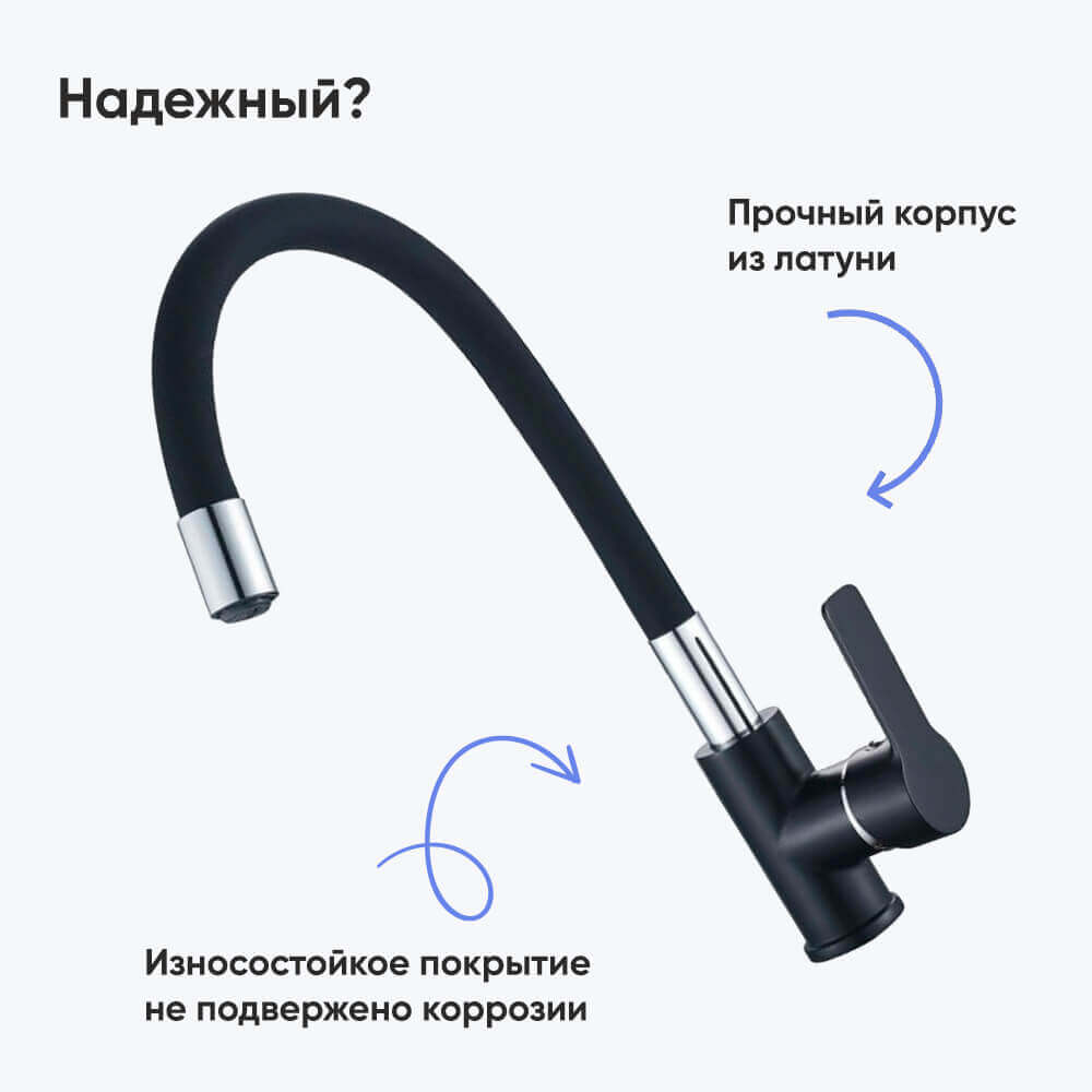 - Гибкий излив более маневренный, чем обычный, и позволяет настроить высоту и угол излива под любые нужды