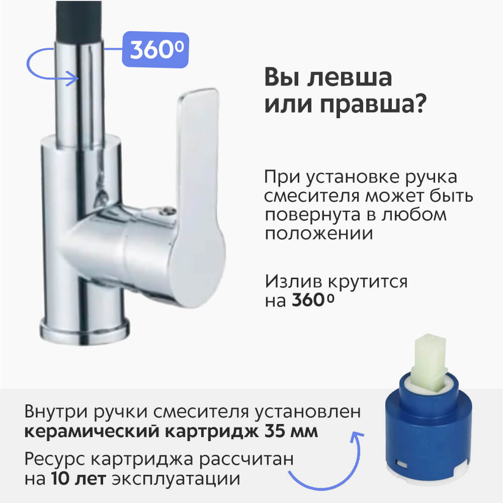 - Кран с поворотом на 360 градусов универсален, подходит к любым кухонным мойкам