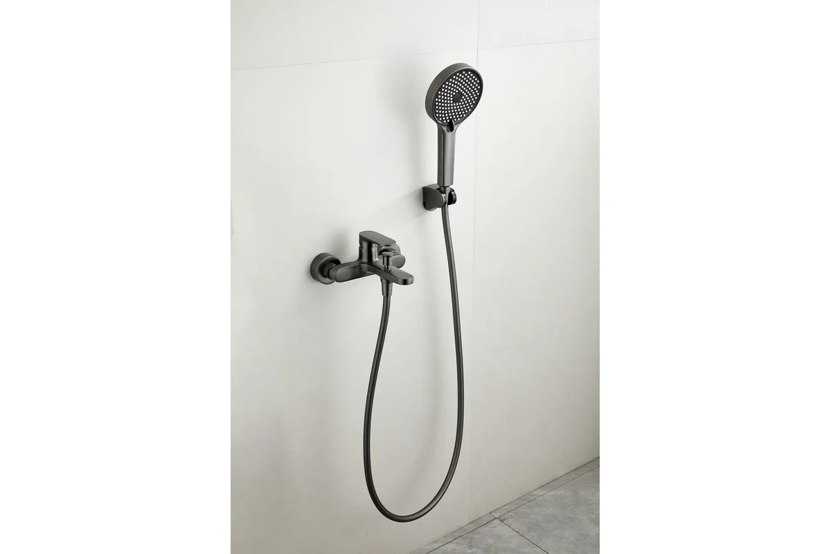 Смеситель на ванну короткий излив BELZ B61713-3 ОРУЖЕЙНАЯ СТАЛЬ лат., кар.30мм, лейка 3реж.(8)