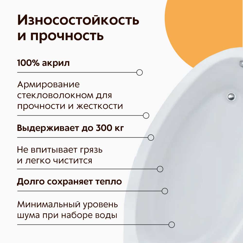 - Ванна долго сохраняет тепло благодаря низкой теплопроводности материала – 100% акрила, армированного стекловолокном