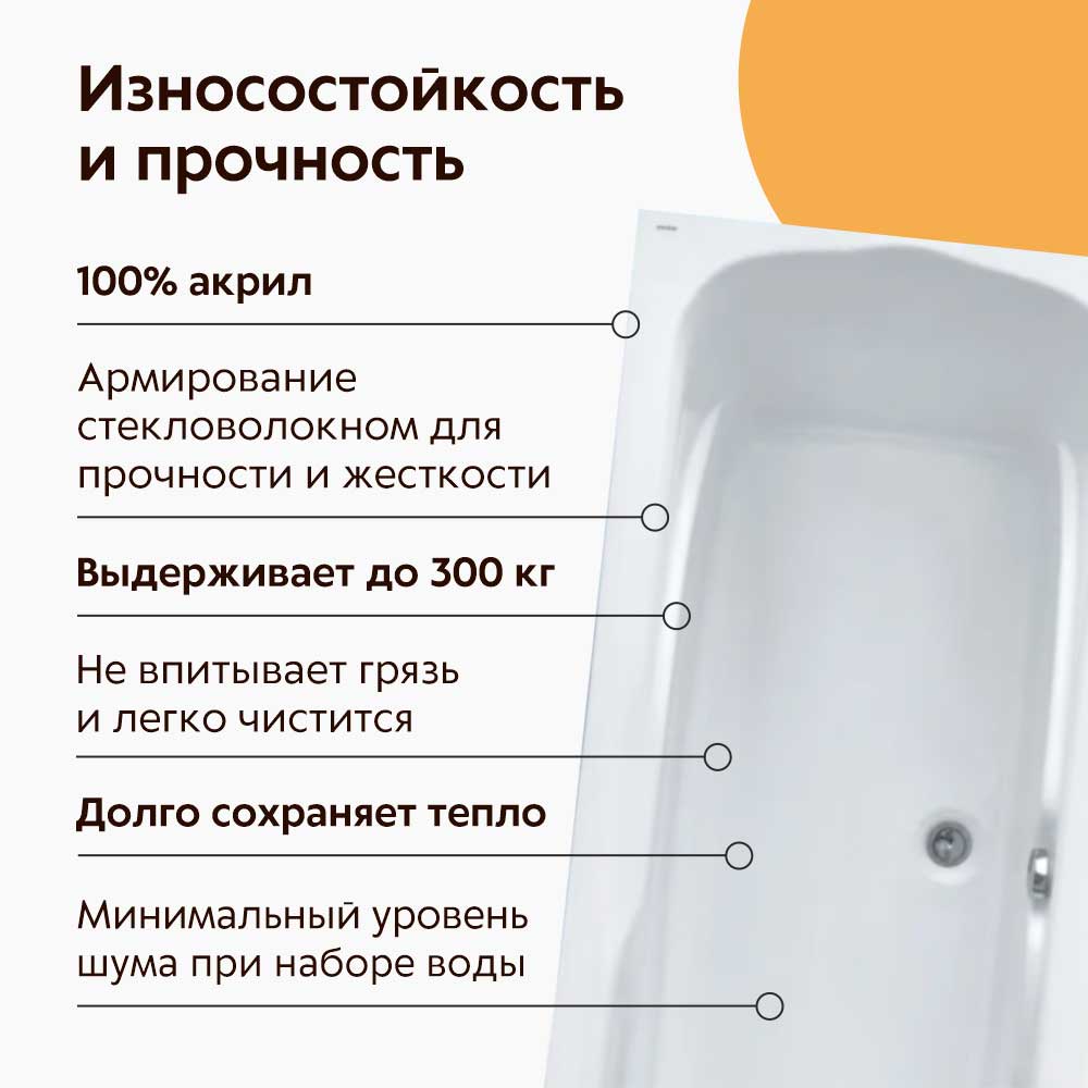 - Ванна долго сохраняет тепло благодаря низкой теплопроводности материала – 100% акрила, армированного стекловолокном
