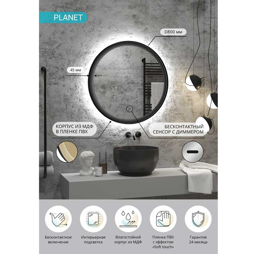 Корпус выполнен из МДФ в черной пленке ПВХ с эффектом "Soft touch", что добавляет ощущение тактильного комфорта и визуальной привлекательности. Подсветку можно активировать простым движением руки на расстоянии до 5 см от бесконтактного сенсора, обеспечивая удобство в использовании.