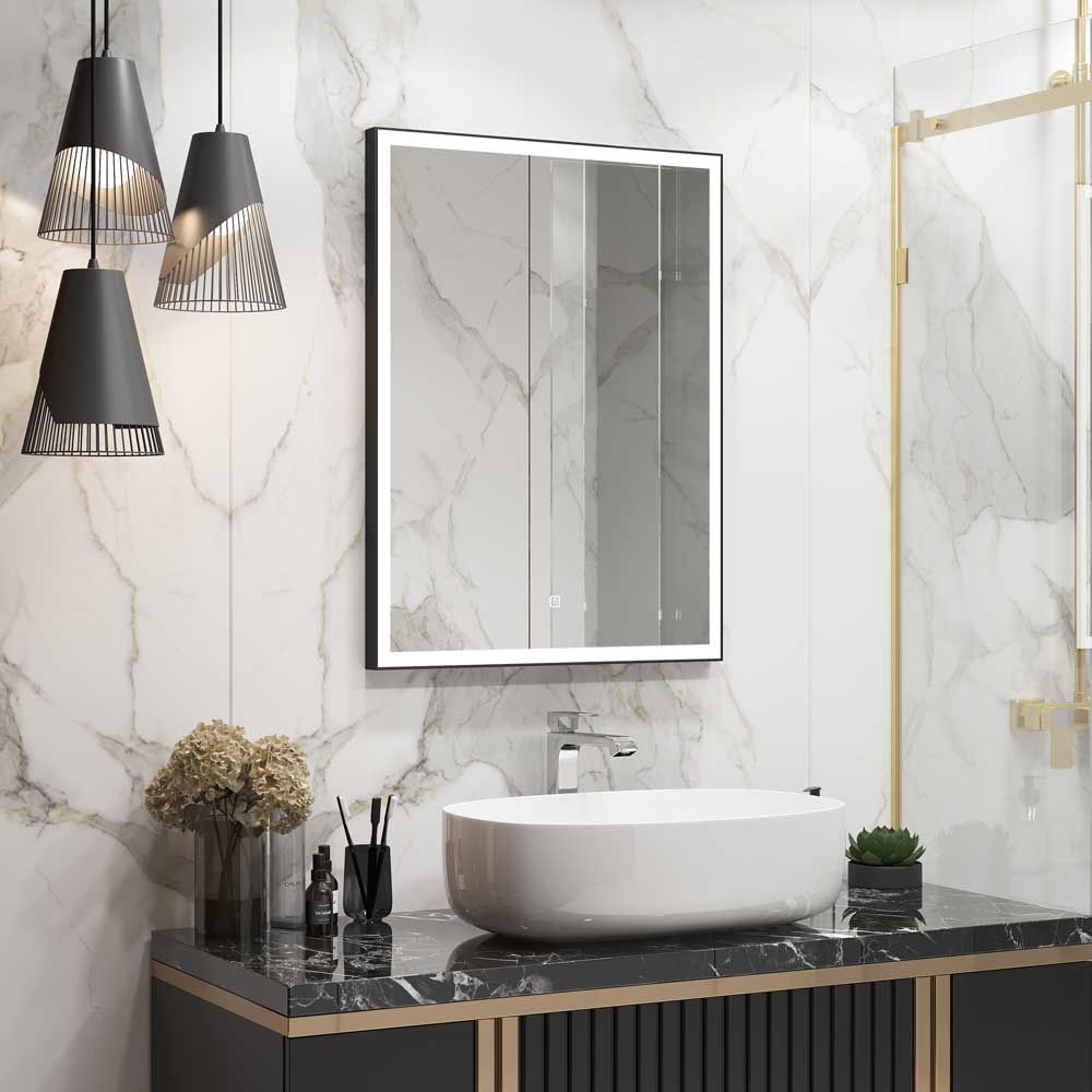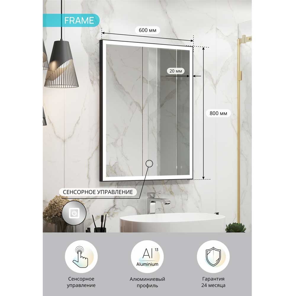 Ширина светящейся полосы составляет 20 мм, а фронтальная подсветка с холодной цветовой температурой 5000K обеспечивает идеальное освещение объектов, отражающихся в зеркале. Подсветка включается просто прикосновением к сенсору, оснащенному встроенным диммером, что позволяет регулировать яркость в зависимости от ваших потребностей.