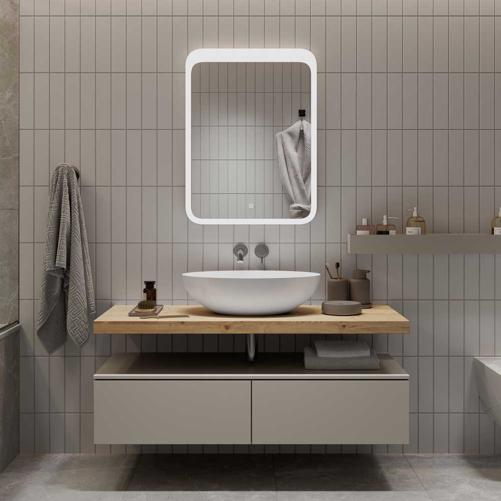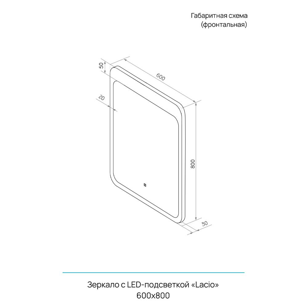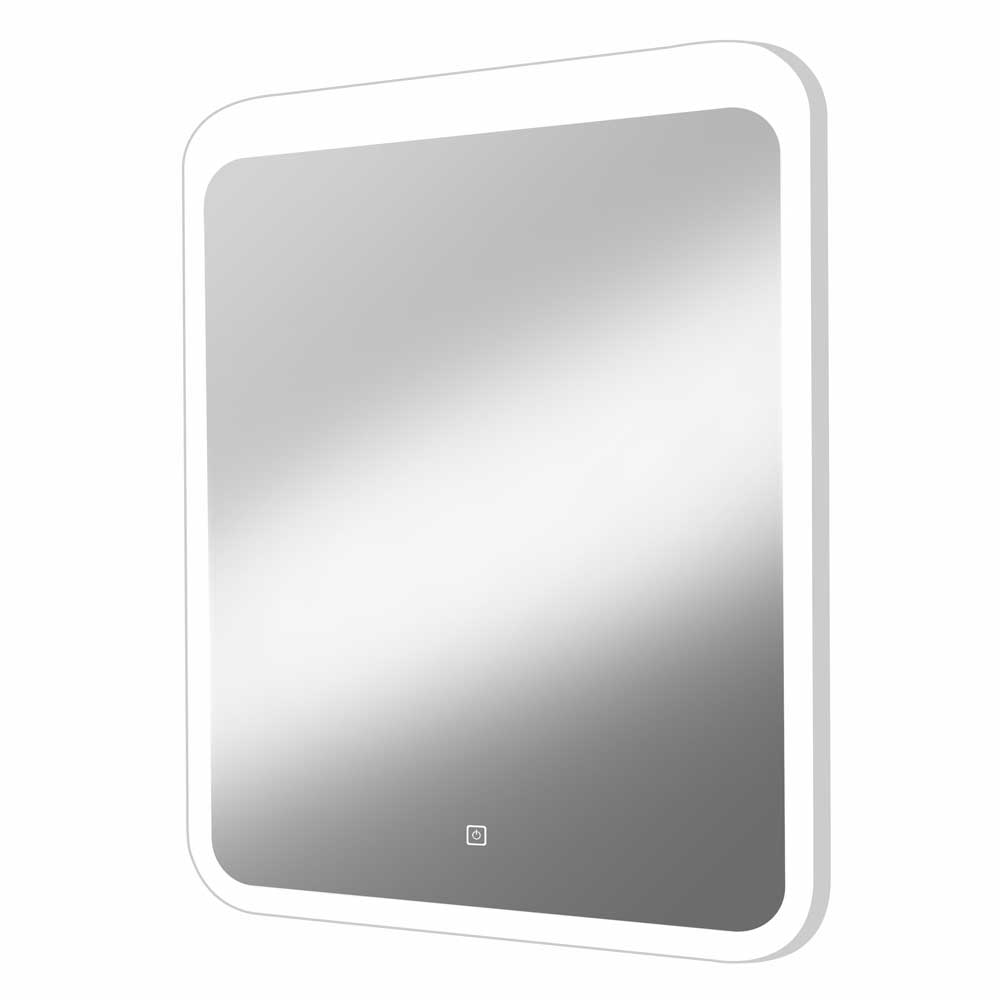 Корпус выполнен из белого пластика. Зеркало имеет фронтальную подсветку с холодной цветовой температурой (5000К), обеспечивающую идеальное освещение отражаемых объектов. Включение подсветки осуществляется с помощью сенсора, дополненного встроенным диммером, который регулируется длительностью касания.