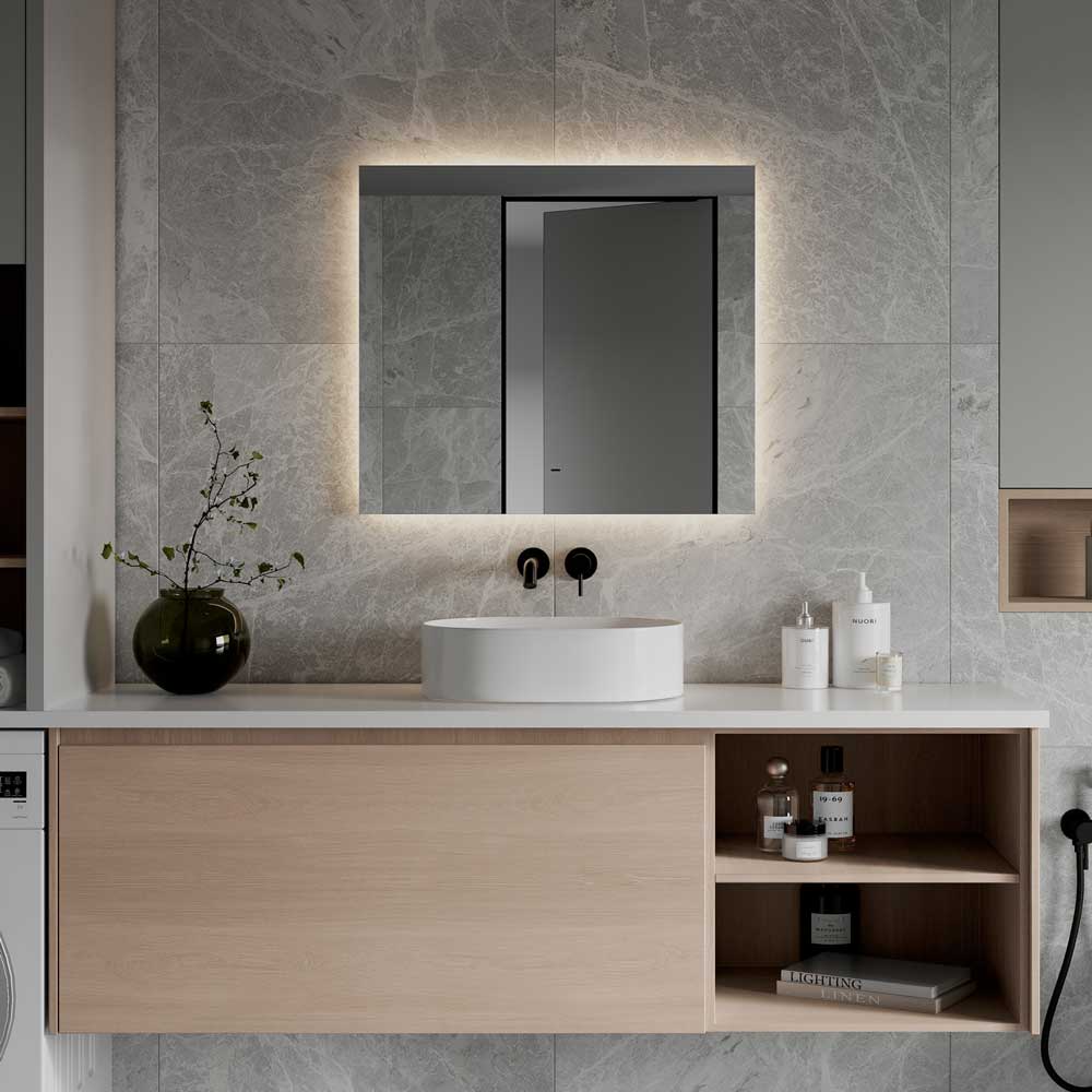 Корпус выполнен из МДФ рамки, а открытая ореольная подсветка создает эффект парящего зеркала. Включение подсветки осуществляется простым движением руки на расстоянии до 5 см от бесконтактного сенсора, что делает использование зеркала максимально удобным.