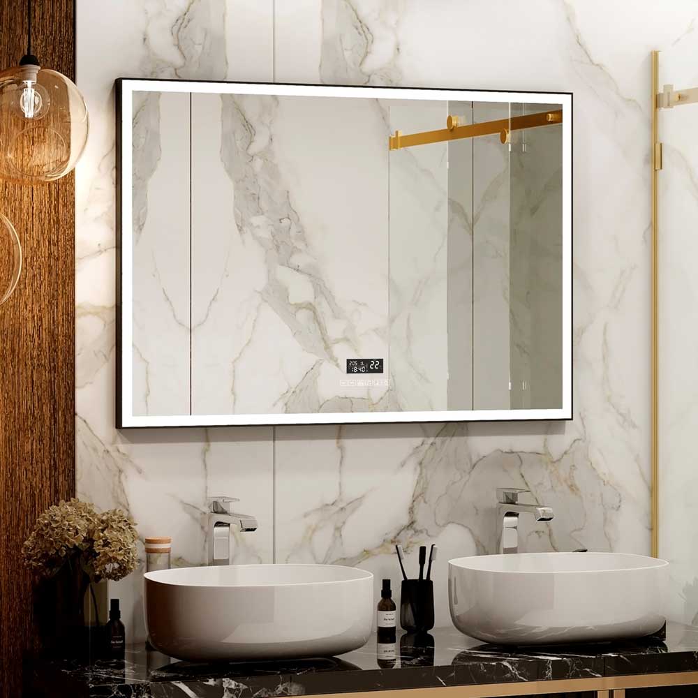 - Дополнительное оснащение зеркала: датчик температуры воздуха, динамик, bluetooth-приемник, часы, подвесы