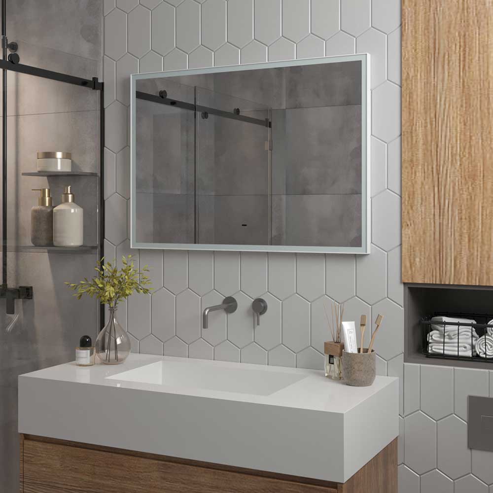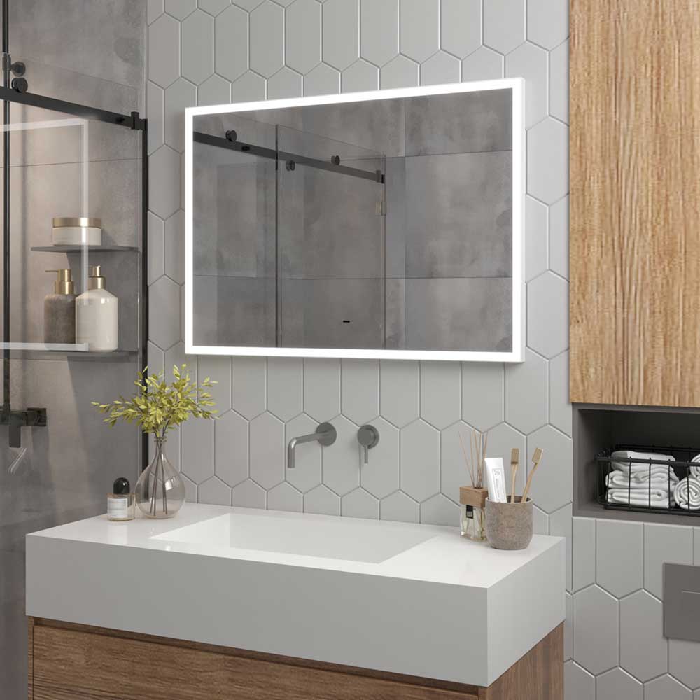 Ширина светящейся полосы составляет 20 мм, а фронтальная подсветка с холодной цветовой температурой 5000K обеспечивает идеальное освещение объектов, отражающихся в зеркале. Включить подсветку можно простым движением руки на расстоянии до 5 см от бесконтактного сенсора.