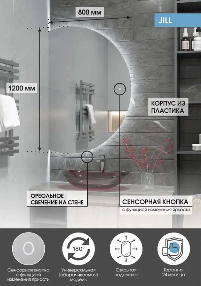 - С подсветкой, сенсорный выключатель, реверсивное крепление