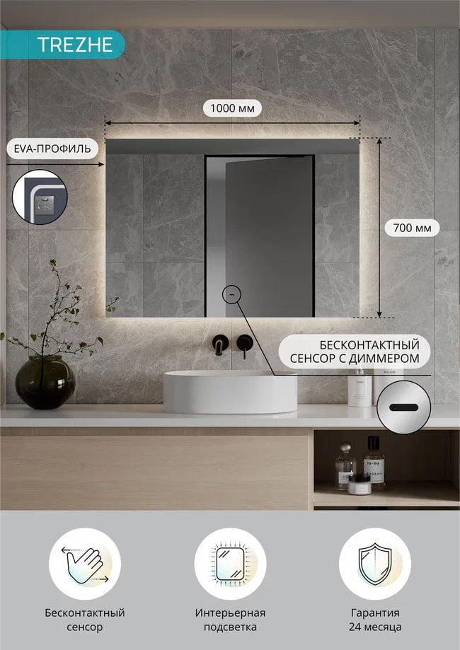 Корпус выполнен из EVA профиля, а открытая ореольная подсветка создает эффект парящего зеркала. Включение подсветки осуществляется простым движением руки на расстоянии до 5 см от бесконтактного сенсора, что делает использование зеркала максимально удобным.