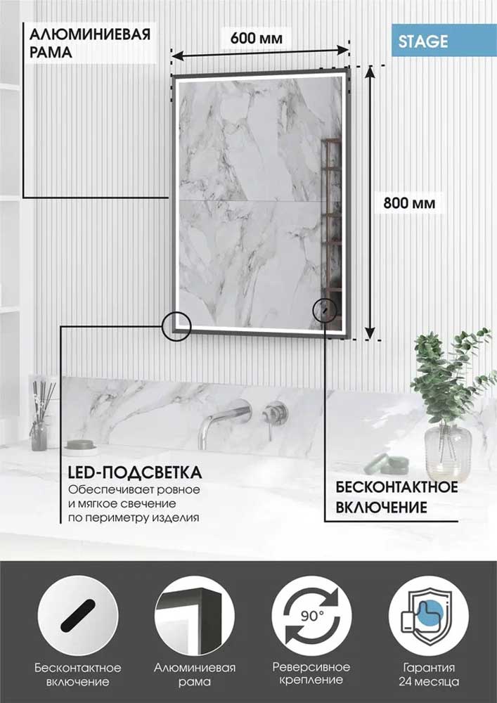 Подсветка активируется простым движением руки на расстоянии до 5 см от бесконтактного сенсора, что делает использование зеркала невероятно удобным.